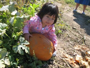 Can she do it folks? Considering the pumpkin wasn’t much smaller than she is and probably weighs about the same, I don’t know if this will be a success or not.