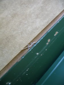 When we got back to our room Dave sat down in the chair and glanced over at the bed and found that we had a friend on our bed skirt. Our little friend needed to be outside so I escorted him to the balcony and took a couple pictures.