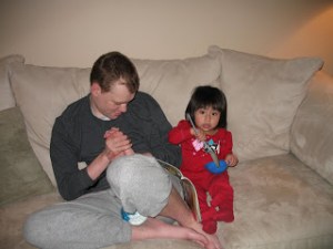 Lili’s first Christmas was fun for all of us, but it was especially enjoyable watching the boys enjoy her first Christmas home. One of the gifts Lili received was a doll that cries, laughs, says momma, makes drinking sounds when giving her a bottle and then burps. Lili wasn’t overly interested in the doll, but Josh wanted the doll out of the box so he could try it out. Ben started out taking pictures Christmas morning because he wanted to make sure we got plenty of pictures for Lili’s first Christmas. I ended up with the camera and we did get some good photos. The boys also enjoyed their gifts, but were really into watching Lili as she took in all the activity of Christmas morning.