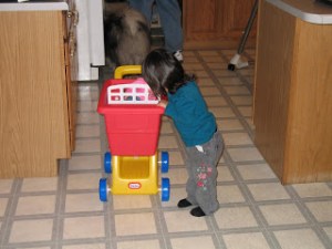 Ben loves Timberland boots and shoes. Santa surprised him with a brand new pair for Christmas and he was “thrilled.” You can’t have a kitchen without a grocery cart for buying kitchen supplies. Here is Lili trying out her new grocery cart and taking her other new baby on a shopping trip.