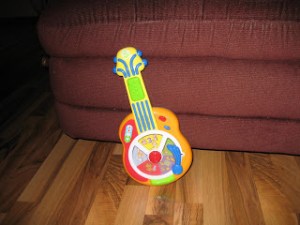 Daddy plays a real guitar and when he’s done playing, he will sometimes set the his guitar propped up against the wall. Lili has apparently been watching and wants her guitar to be just like daddy’s guitar. Here is where she put it.