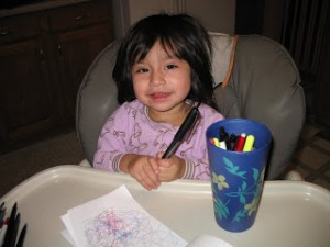Several months ago Lili discovered her new love, “coloring.” She will sit in her high chair for an amazingly long period of time just coloring. Recently she’s begun asking to cahyer (color) before she has even had breakfast. I’ve explained that she can color after she eats breakfast, although this has typically resulted in a toddler temper tantrum. What’s become even more concerning is that a few times she’s eaten just a couple bites of food, handed me her plate and then said “cahyer.” Seriously, she’s already figured this one out! She’s not even 2 yet. I’m in trouble!!!!