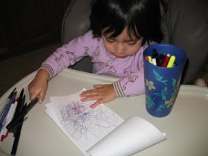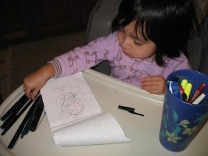 It’s not just crayons that she enjoys coloring with, she also loves using pens and pencils. We have a cup on our counter full of pens and pencils and she will sit and pull a pen or pencil out of the cup, use it on the paper then set it aside and pull out the next one. After she has used each one she puts them back in the cup and starts all over again. As I watch her do this I find myself wondering what she is going to be when she gets older. What do you think?