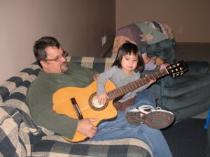 Lili loves the guitar or as she would say, “gar.” Lately she’s been sitting on daddy’s lap and he’s been teaching her the proper way to finger the chords and strum the guitar.