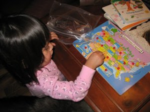 A few weeks ago, one of Lili’s aunts brought her a new puzzle. It’s my understanding that a 22 month old child should be able to complete puzzles as big as 6 pieces, but our little girl is able to complete her new 12 piece U.S. puzzle in record time. Here she is as she fits the last piece of the puzzle in it’s place.