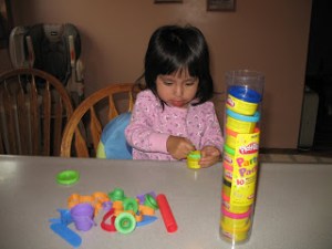 Enjoying her tower of Play-Doh. Thanks grandpa and grandma!