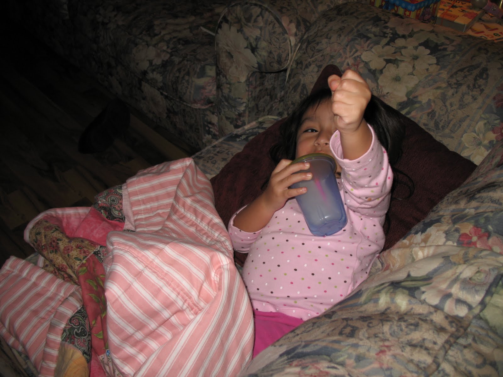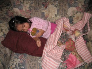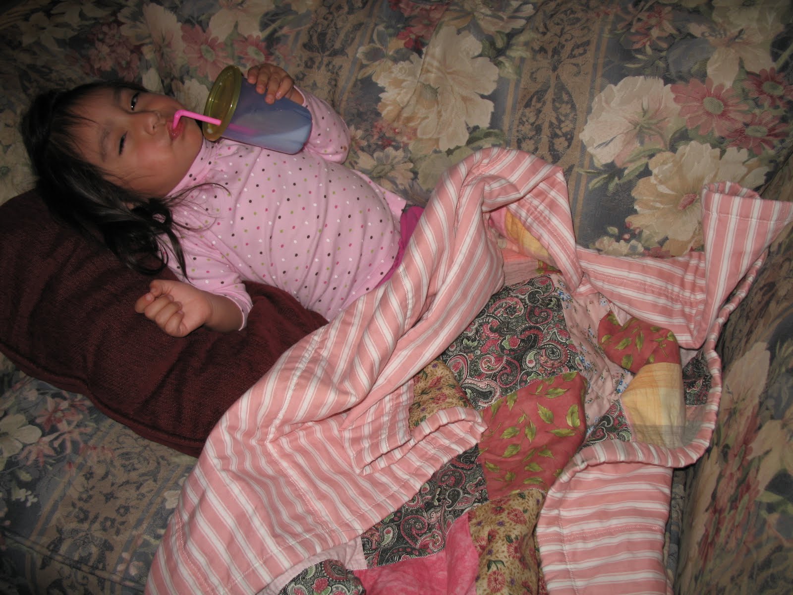 A couple weeks ago I met up with my long lost best friend from high school. Not only did we have a wonderful time trying to catch up on the last 30 years, but she had also made a beautiful quilt for Lili. Lili loves her new quilt and frequently tells me, “Yiyi’s banket.” I confirmed, “Yes, that’s Lili’s blanket.” Everyday she takes her nap covered up with her new quilt and enjoys laying in our over-sized chair all covered up watching Dora. A few days ago I finally broke out the camera and snapped a few photos of Lili with her new quilt. Thanks to my friend Krys, Lili has a treasured blanket keepsake.
