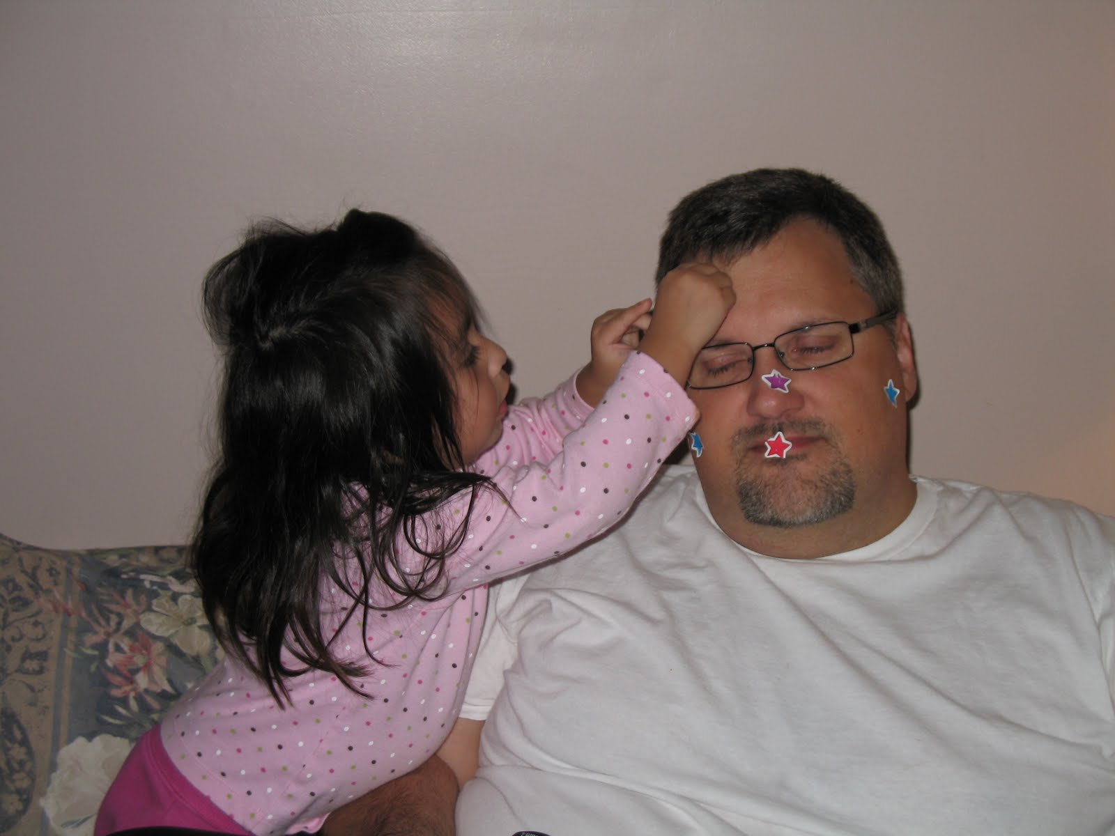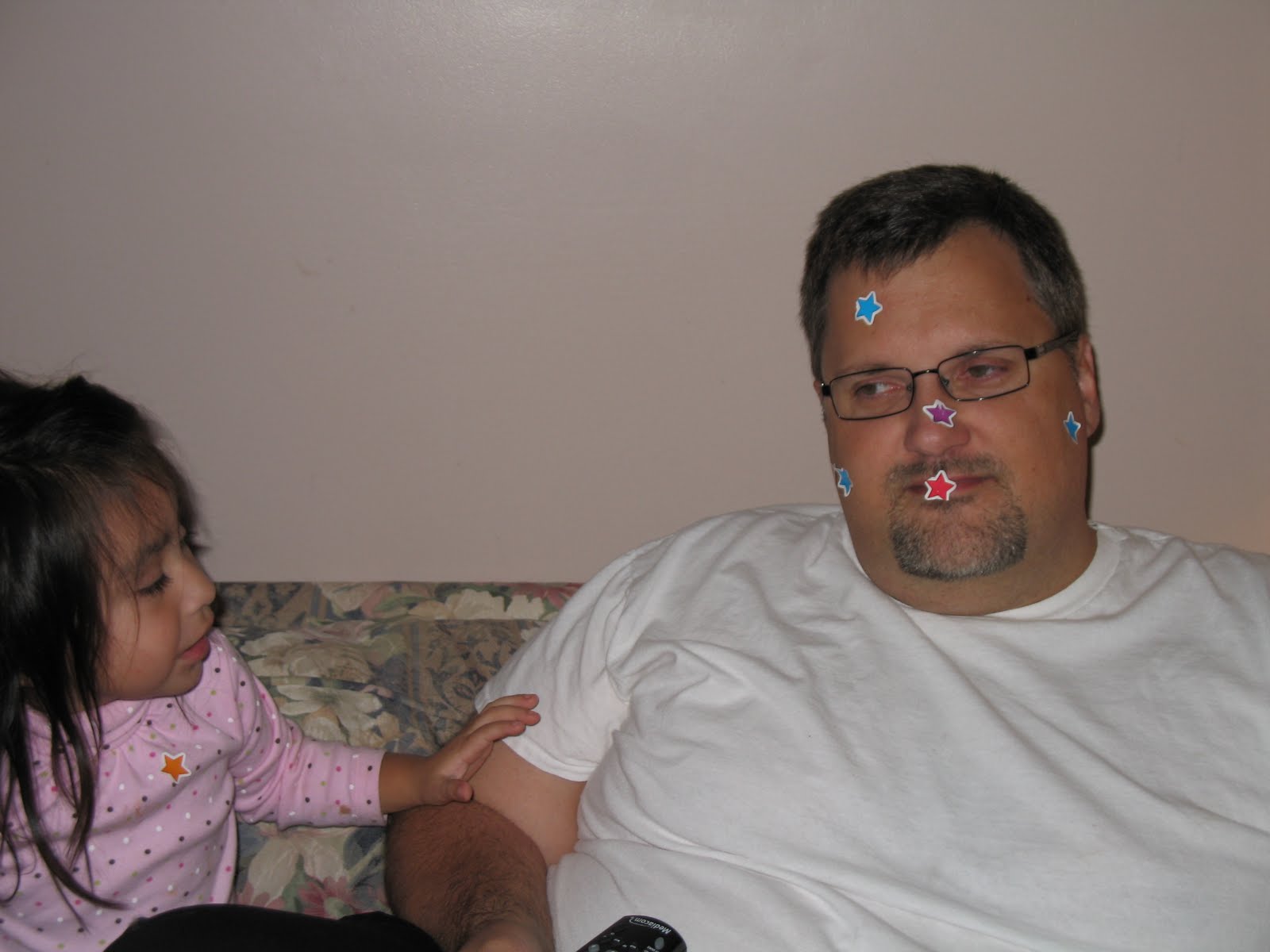 And now for no special reason, here are some pictures of Lili decorating daddy with stickers.