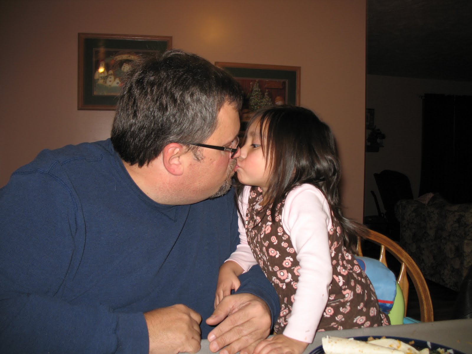 1. I love pictures of Daddies and their little girls. I impressed with the face picture. Joshua just figured out how to draw circles which is ahead of when I remember a couple of my older kids doing that. But he isn't making faces yet. Impressive!