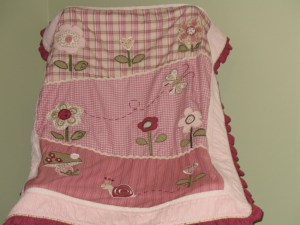 Little did I know that my post about my paint dilemma would generate so many requests for photos. I was going to wait until the room was furnished, but I’m not quite sure when that will happen and I didn’t want to keep so many waiting. So, I took my camera upstairs, threw the crib comforter over the rocking chair and snapped a few pictures. Hopefully this will satisfy everyone’s curiosity until I am able to take photos of a completely furnished and decorated room.