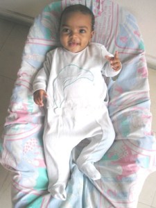 On February 4th she weighed 15.87 lbs and was 24.40 inches. She was diagnosed with infant eczema and treated. The doctor states she is an active young infant with adequate growth & development. She has a good appetite and sleeping cycle. She drinks 180ml of formula milk every 3 hours and she also has supplementary feedings. She sits with support, transfers objects from one hand to the other, babbles and reaches out for familiar people. She is stable and thriving well.