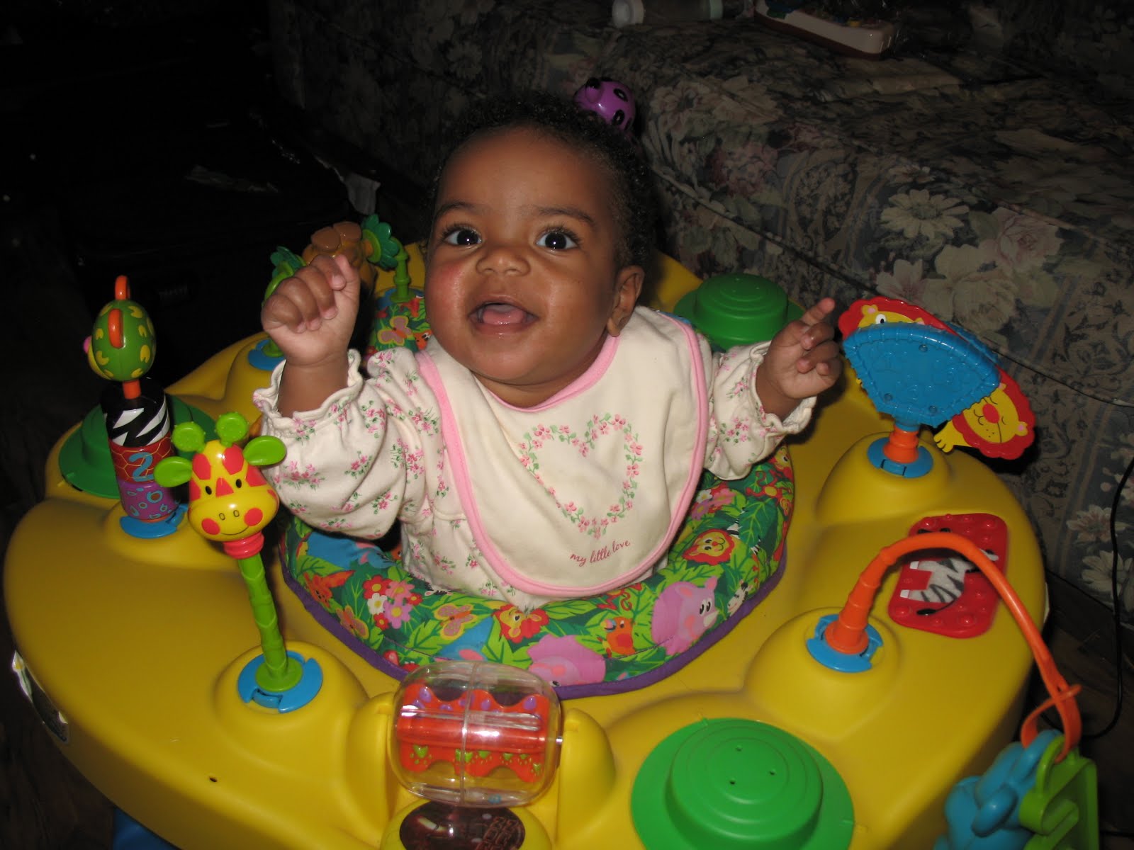 Today she had her first appointment with the pediatrician. She now weighs 17 lbs and is 27.5 inches long. That puts her in the 15th% for weight and 40th% in length. He addressed her development and said there is absolutely no problems with her tone and it is strictly due to lack of opportunity. He has no doubt that she’ll catch up in no time. The only other problem, which isn’t necessarily a problem at all is that she has a mild case of eczema and he suggested that we use Eucerin cream all over her body. Other than two very minor things, she appears to be very healthy, happy and social. We concur!