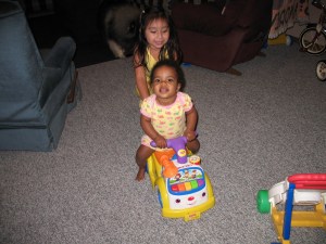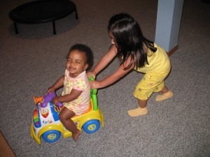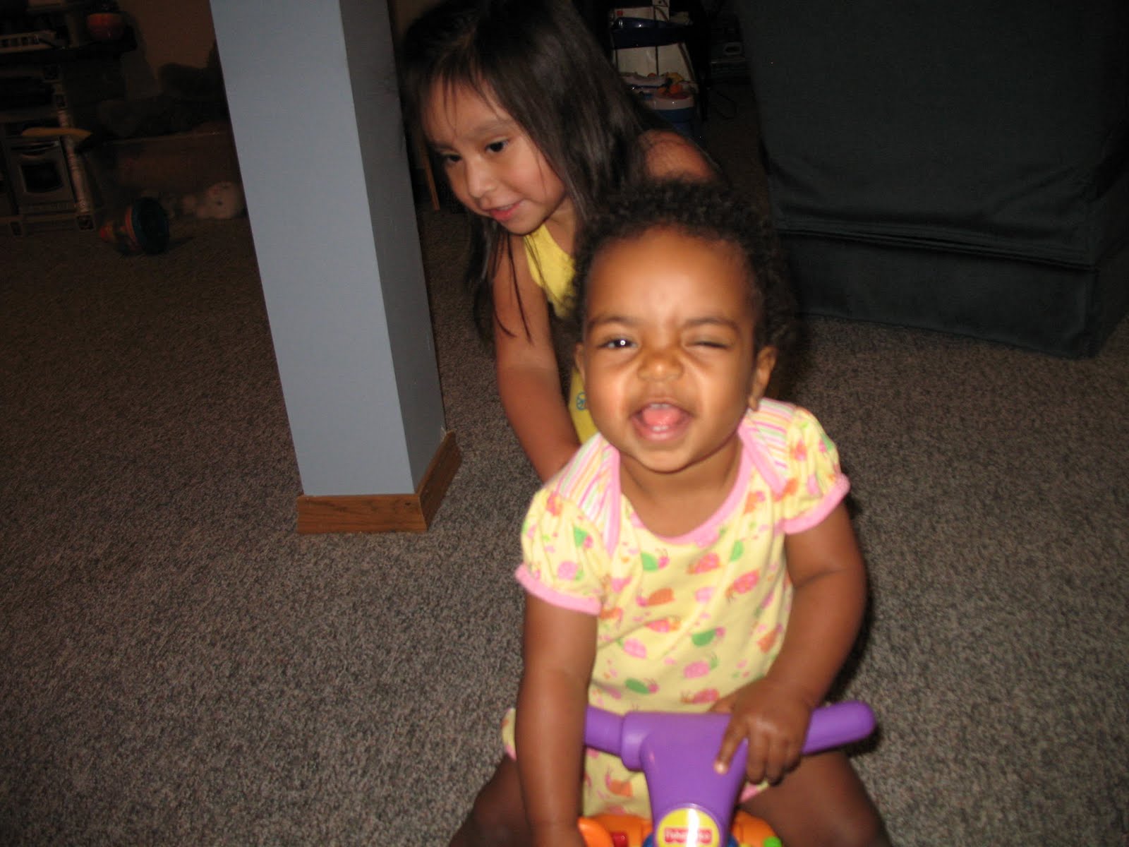 Being pushed around by her big sister is great fun. She could care less that she was being pushed into the walls or the big swing set box that has taken up residence in the basement. She was having a blast!