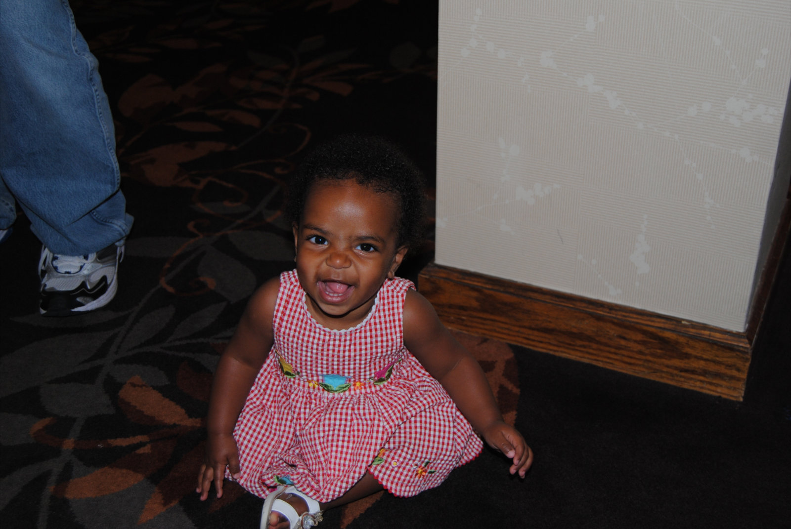 She was definitely having a good time and trying her best to keep up with the other kids. A couple times she was sure she could run around with them and quickly realized that she wasn’t yet able to walk on her own, let alone run. That has now changed, but she wasn’t walking yet that night.