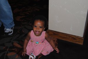 Our TAFRU meet-n-greet began at 5:00 p.m. in one of the hotel banquet rooms. We had 12 families in attendance and the cameras got quite the work-out that evening. I would have to get out my paperwork to verify the numbers, but we had about 20 kids, about 15 of them from Toukoul in Ethiopia. Knowing these children went through Toukoul to their forever families was amazing and I found myself getting a little teary just looking at them run around and play together. Because I don’t want to share pictures of other’s children without their permission, I’ll only be sharing the one photo of Naomi I managed to get that evening that didn’t include other children.