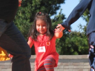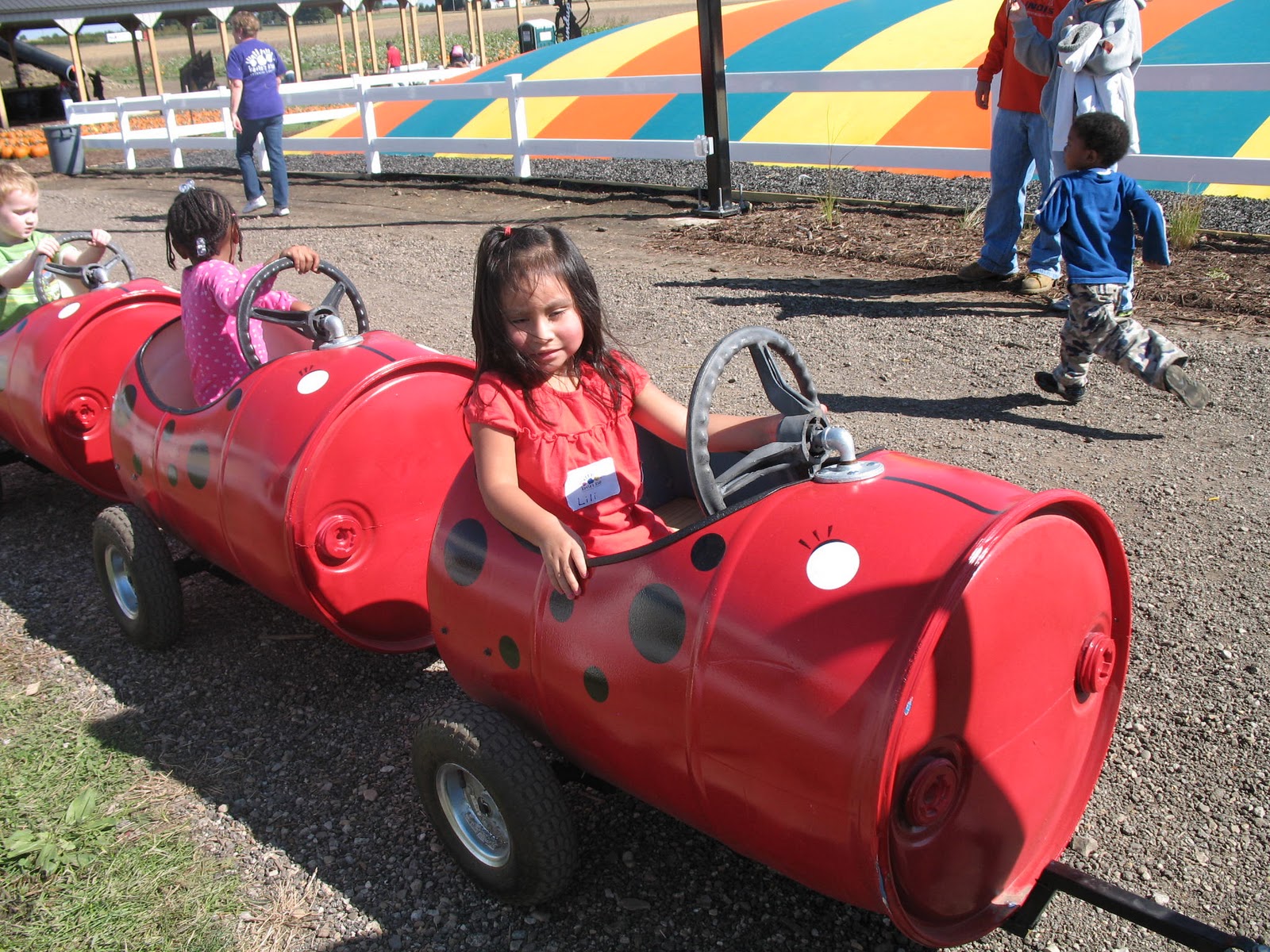 I enjoyed being at the farm today, but Lili also had a great time. She got to ride a school bus; went on a hay rack ride out to the pumpkin patch and picked her own pumpkin to bring home; got to feed the goats, pet a donkey and some baby pigs; chase chickens around the farm; take a ride the ladybug train; jump on the inflatable hill; and have lunch with her friends.