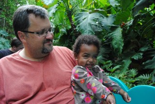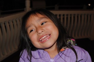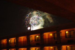 | Managed to get a smile out of Naomi for this picture. We were waiting for the fireworks to begin and she wanted to get down and go. If you look closely, you’ll see the tears on her face. Poor baby! |