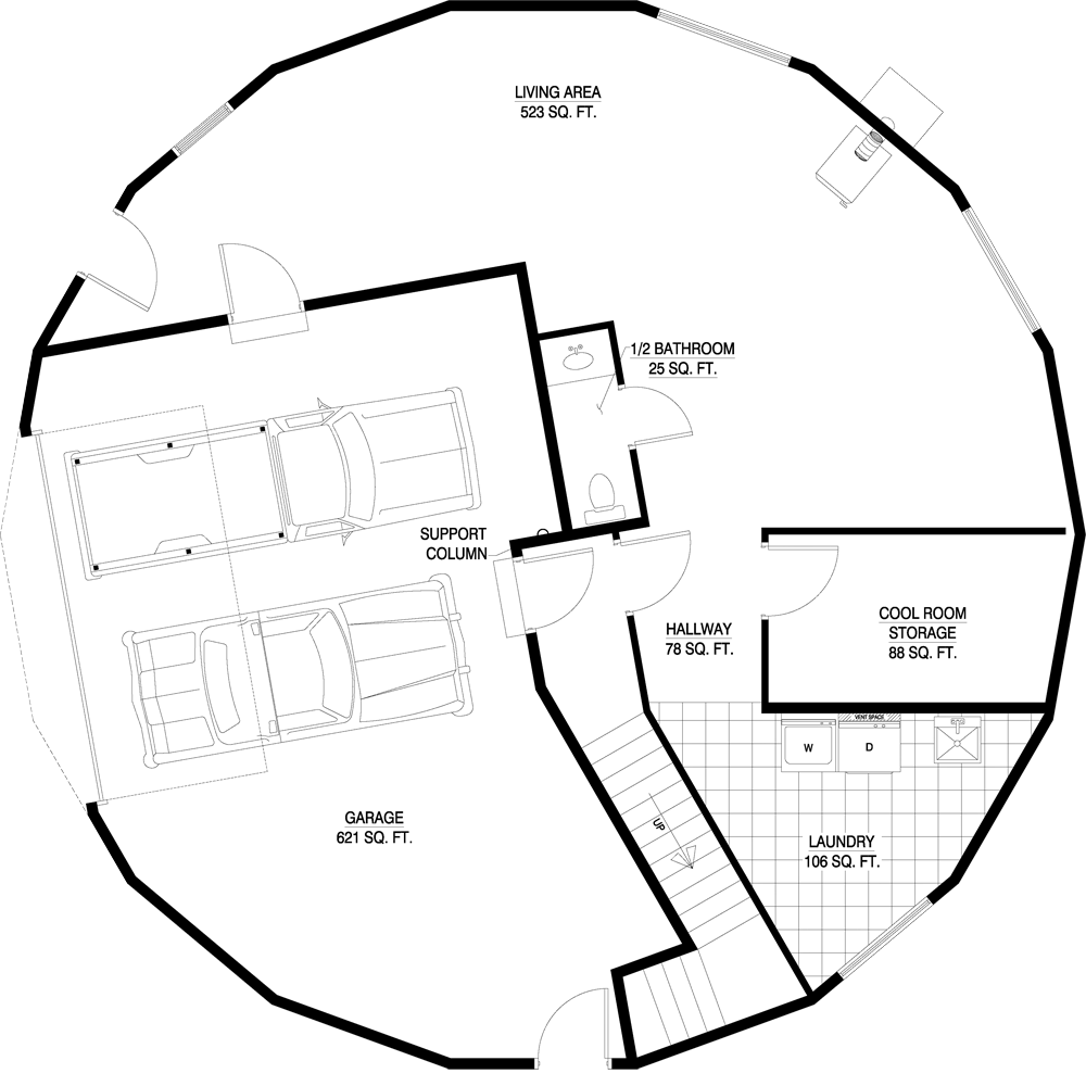 Then one day I was introduced to this website. This company builds pre-fab Yurt-like round houses. Instead of fabric walls, this would have solid built walls. Then I found this floor plan on the website . . . . .