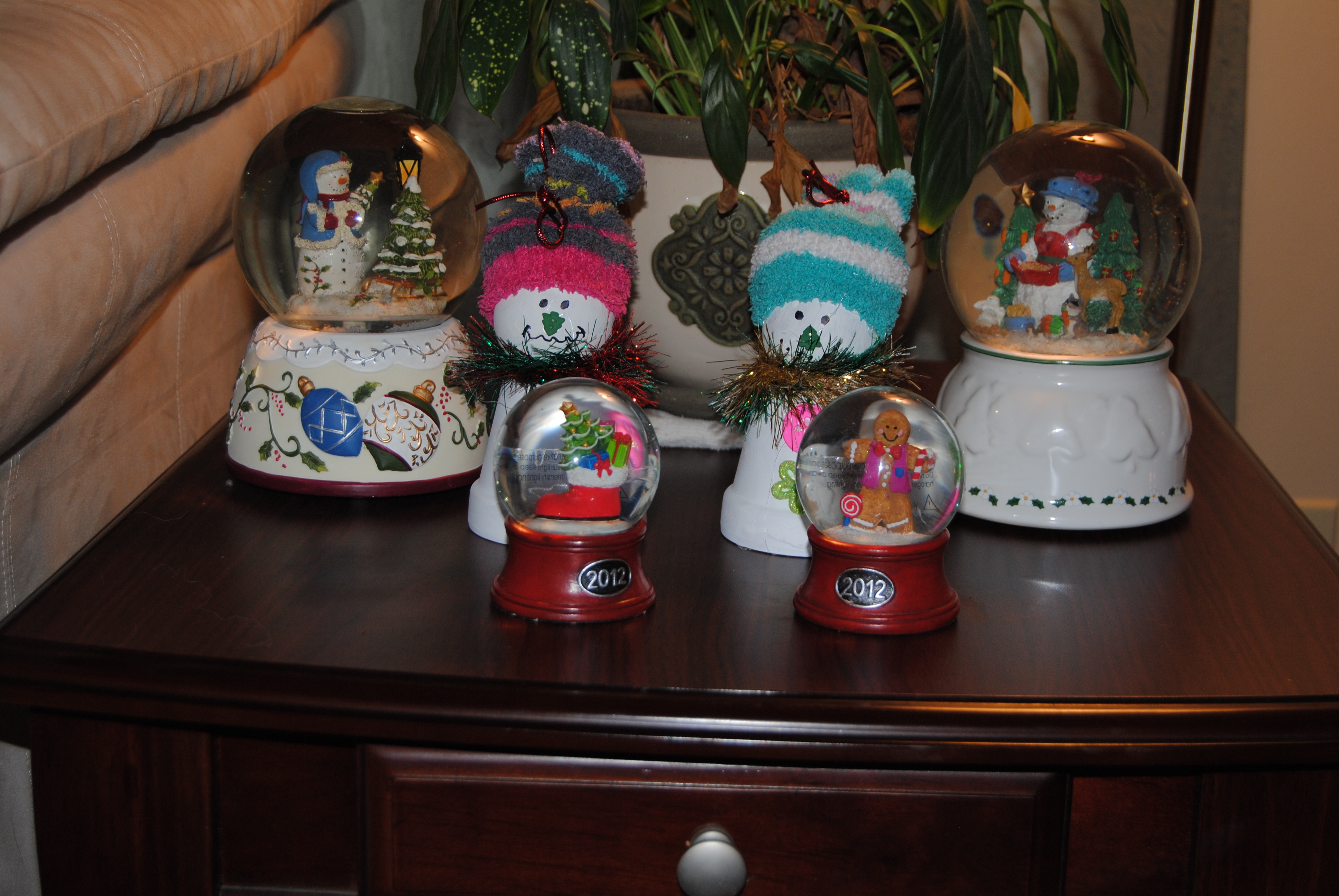 Then we created snowmen using small terra-cotta pots and wooden balls. First the girls painted the pots and balls white. Using our hot glue gun again, we glued the wooden balls onto the bottom of the terra-cotta pots and drew eyes and a mouth to create the face. The girls each chose a small button and glued it onto their snowman to create the nose. Buttons were glued down the front of the snowmen and fun sparkly yarn was used as a scarf. To complete the ensemble, I cut the heel and toe from a pair of Naomi’s outgrown fuzzy socks. We glued the top of the socks onto the snowmen heads, stuffed with a little fiberfill and tied it at the top with sparkling elastic string.