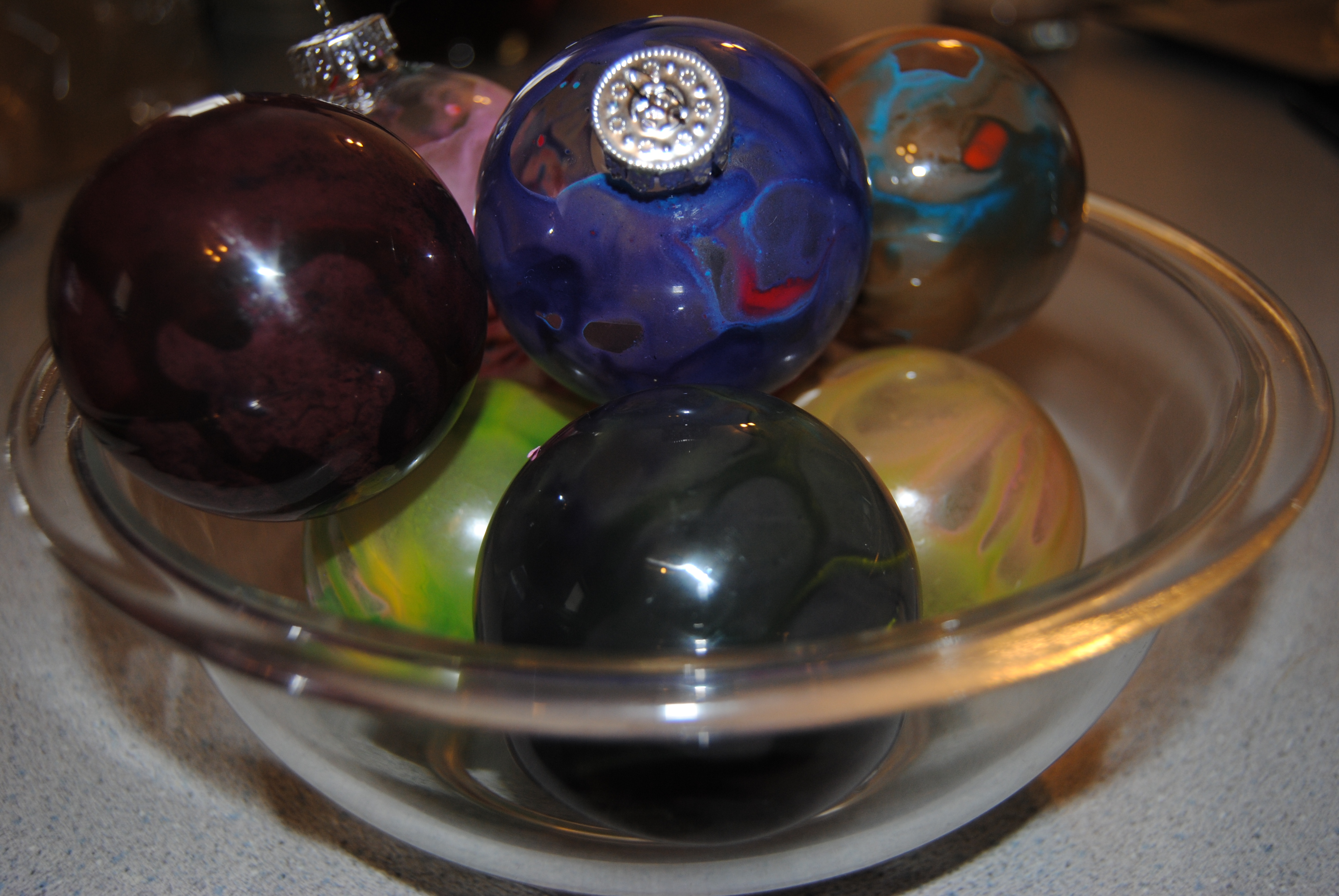This time, I cut up small pieces of crayon and we put the pieces in ornaments. Using a blow dryer, we melted the crayon and rolled the ornament around to create different color combinations.