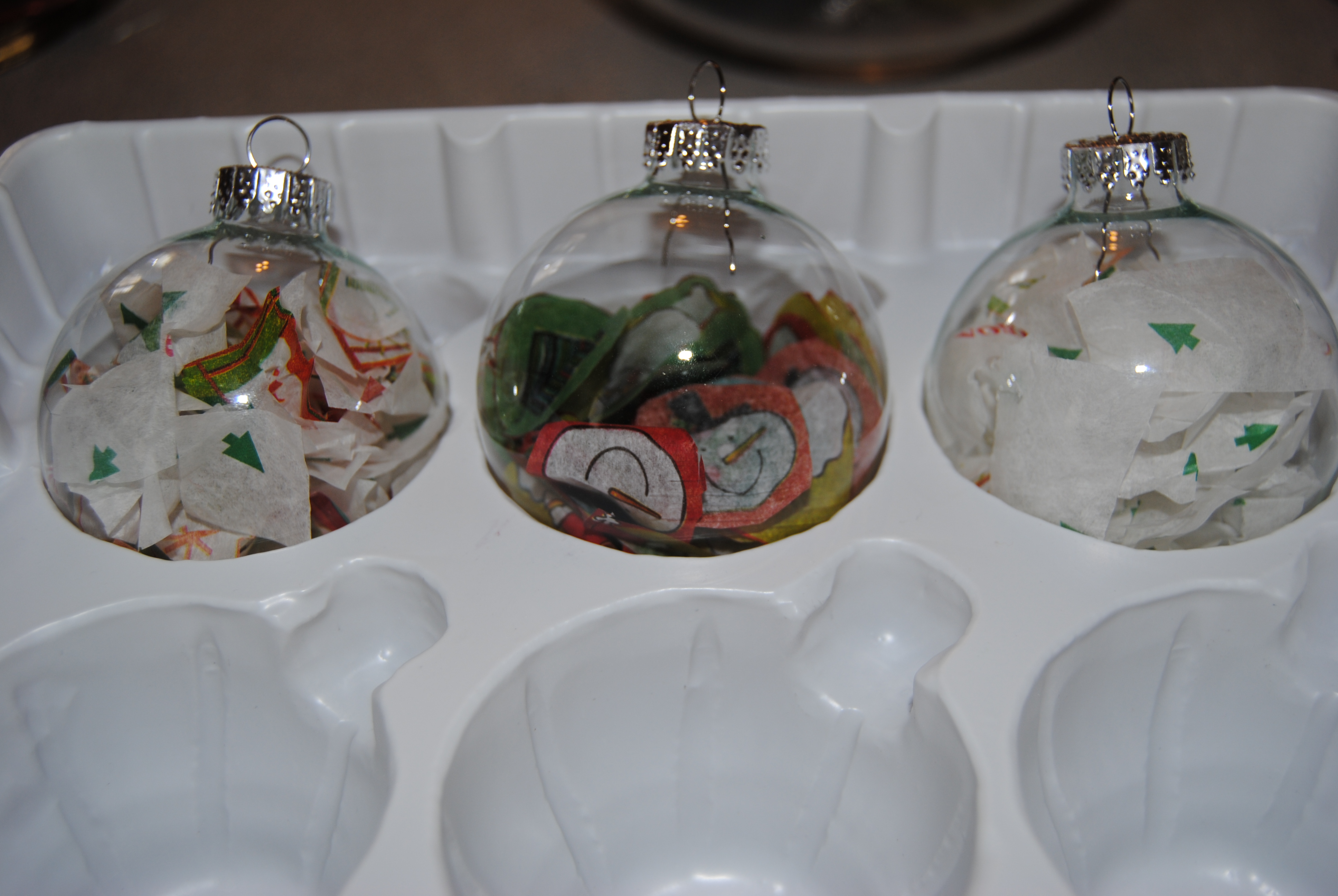 First we cut festive tissue paper into small pieces, then put the pieces into clear glass ornaments.
