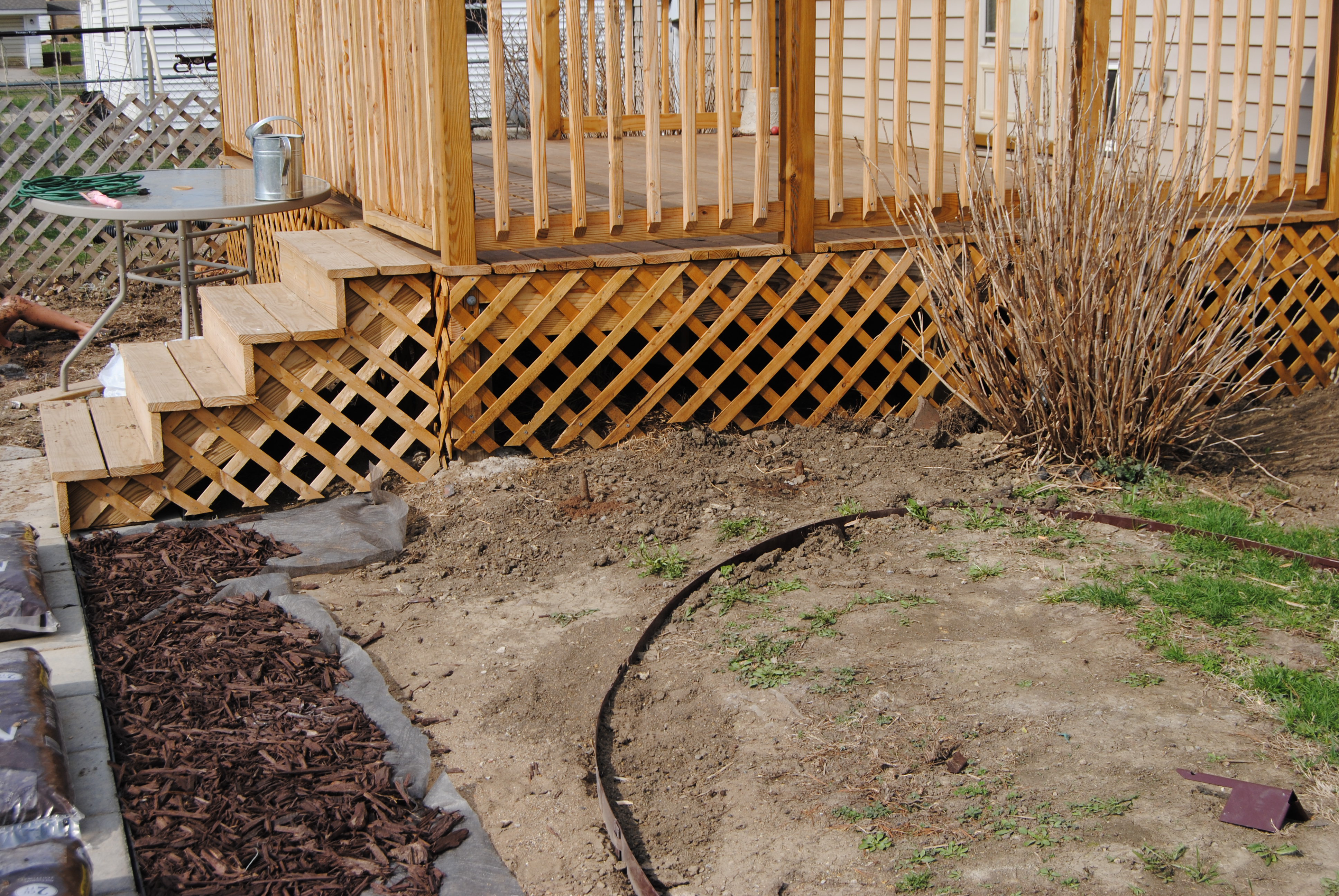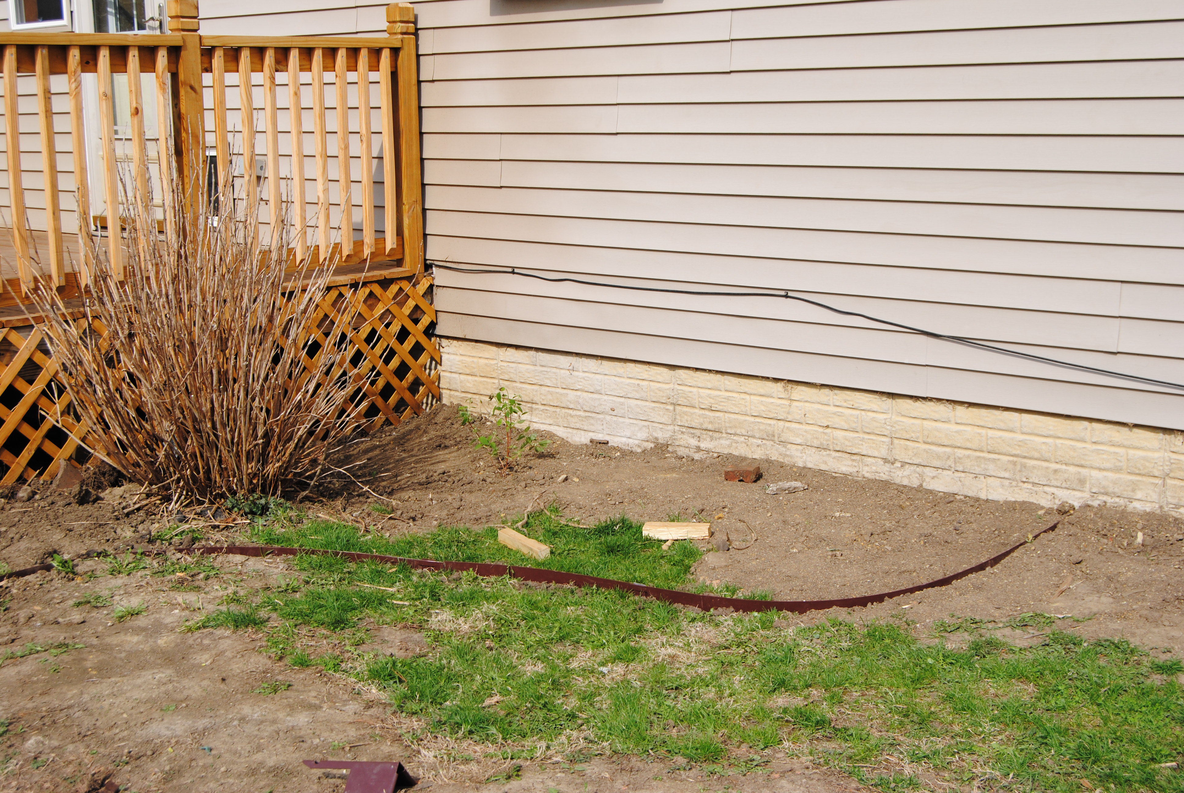 After I got everything planted, hubby and I got busy working on our big landscaping project.  We are putting edging around the deck and patio.  It took us a few minutes to get our system in place, but once we got it going, it began going faster than we expected.