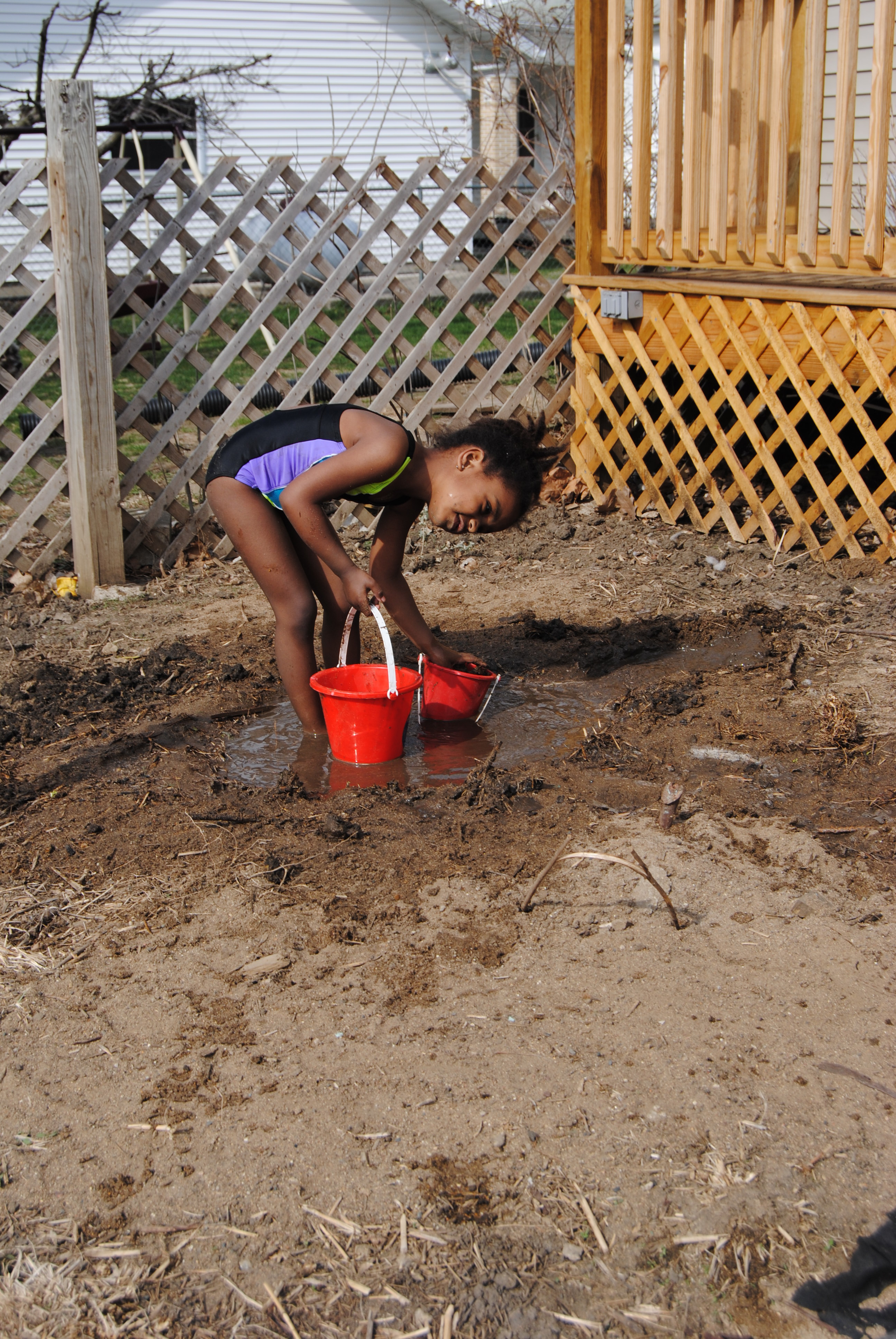 Before long, they were carrying buckets of water back to the sand pile, which is nothing but dirt underneath.