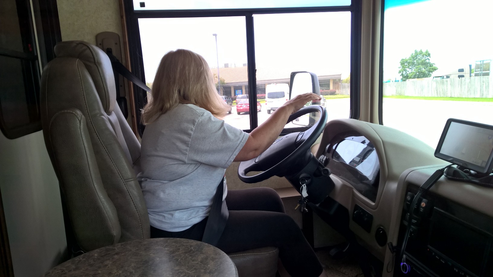 We pulled into a Flying J Truck Stop and I threw together a quick-lunch, but after lunch we had a little change. Change of drivers that is. Hubby was tired and needed me to take my place behind the wheel for a while. Other than pulling Georgette up a couple of feet at a campground, I hadn’t driven her yet and I was nervous. However, I was more nervous about hubby driving while tired, so I cleaned up from lunch, got everyone buckled into their seats and sat in the driver’s seat. Hubby gave me some instructions and we were off. I pulled out of the parking lot into the street, turned at the stop light and exited toward the Interstate.