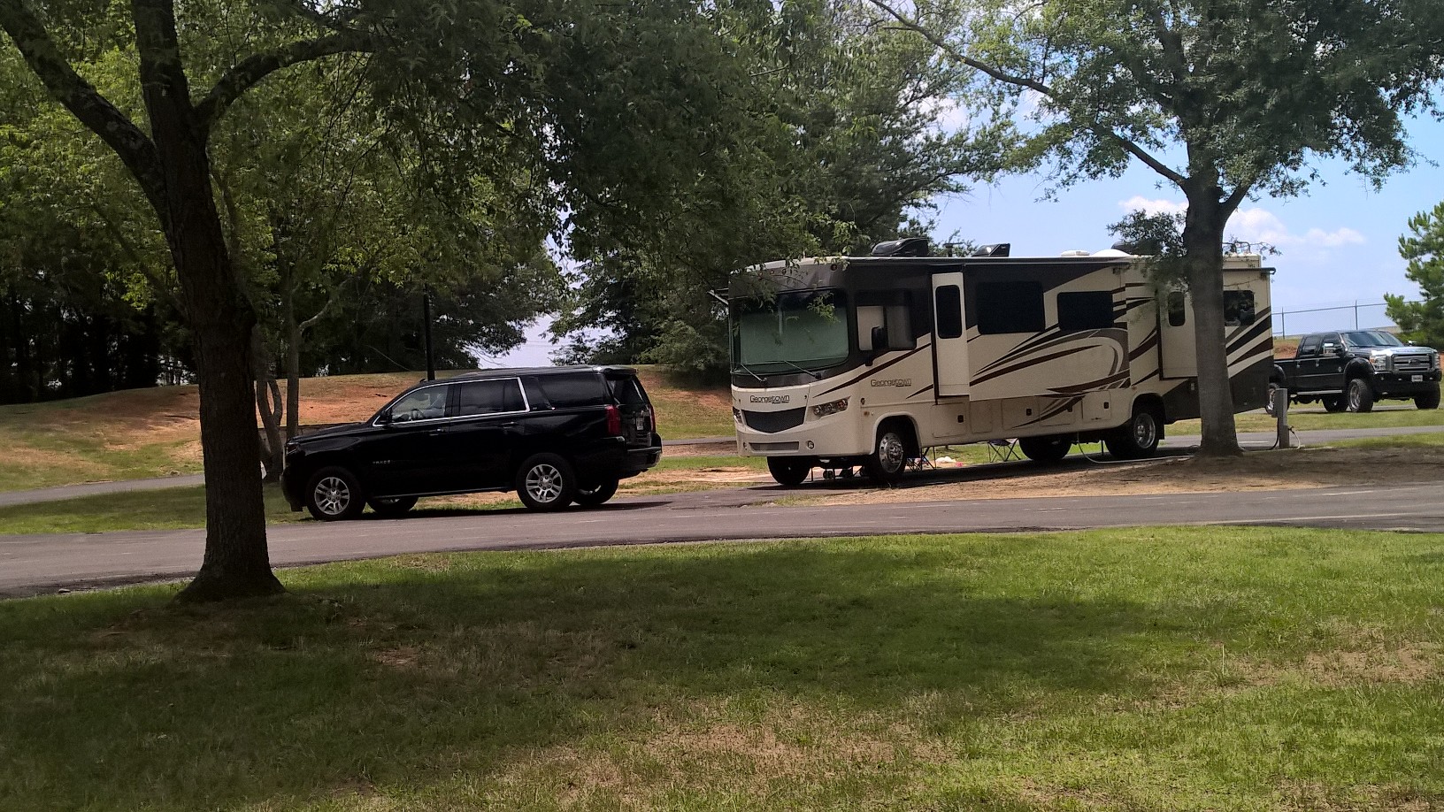 Georgette, with me still behind the wheel, pulled into Carowinds Camp Wilderness where we would stay for a few days. Hubby got us checked in and I drove to our camp space, parked Georgette, got her leveled and we began setting up camp.