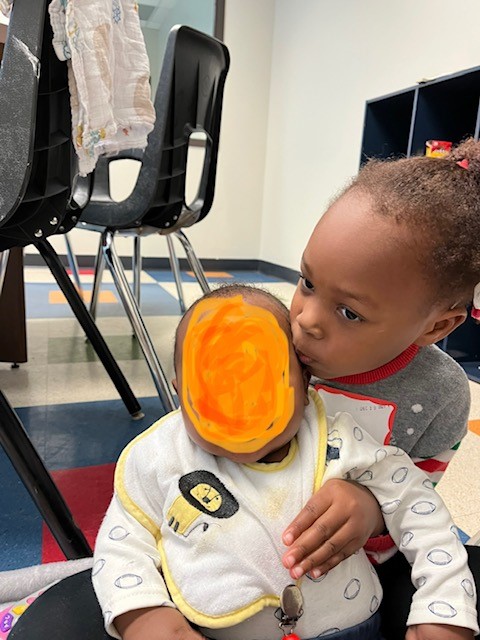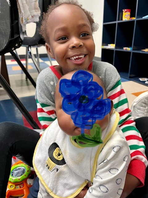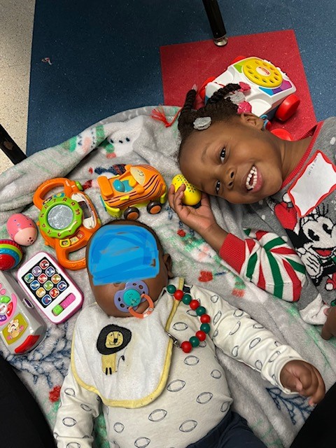 The visits are at the CPS office, so we took some soft blankets and toys with us on this visit. The blankets gave us a nice, soft place to play. It was also easier for laying him down to change his diaper and gave him a chance to stretch out and move without having someone holding him. At one point Arryn got down beside him which was a nice photo op. It was also similar to a photo I have of her and her other baby brother.