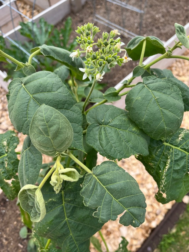 One other thing we planted in a pot this year is a Tamarillo. I had never heard of this before, but hubby saw them online and wanted to try it out. I was worried about it because it wasn’t looking good when I moved it outside, but now it has a lot of leaves and flowers.