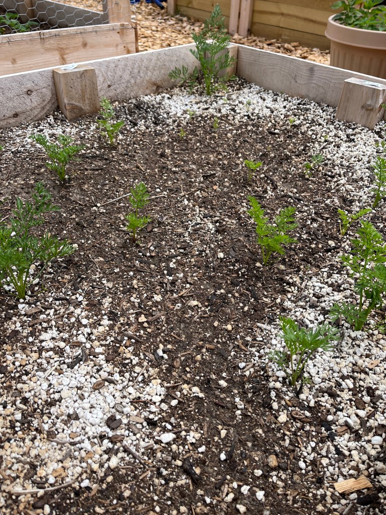 Because one of the kids requested we grow carrots, we have a small bed specifically for carrots. I had only tried to grow carrots one other time unsuccessfully. This time, I worked to get the soil as light and fluffy as possible. The two littles helped me put the seeds in the ground and we currently have 26 carrots growing. Hopefully the soil is fluffy enough that we will get some nice carrots to eat.