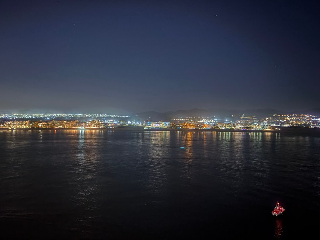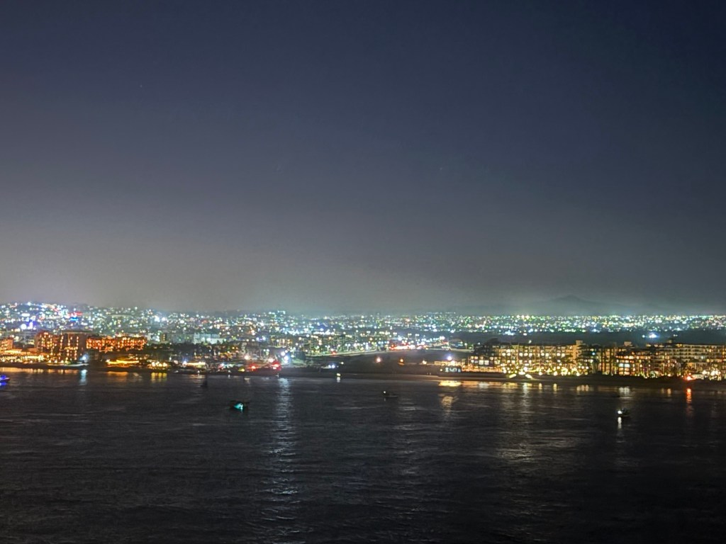 Because we didn’t arrive in Cabo until afternoon, we left port after dark.