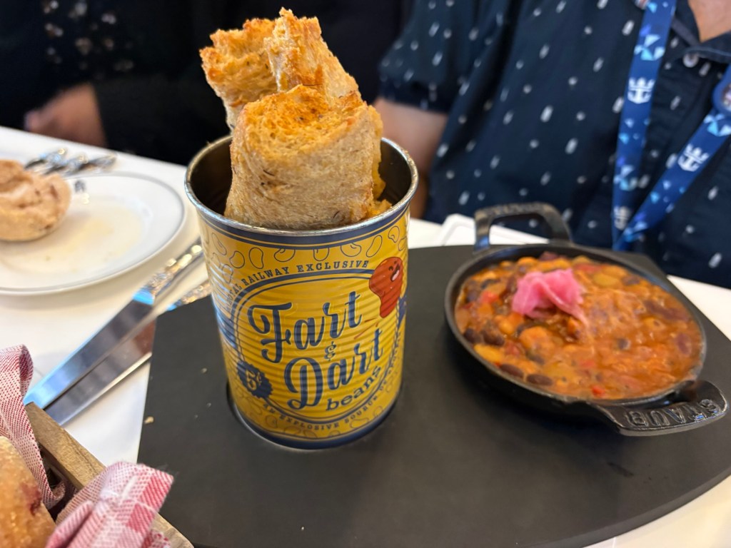 After dropping them at Adventure Ocean for kid fun, we headed to our dinner at the Royal Railway. This is a specialty dining experience unique to this ship. Think old west vibes, boarding passes, cherry tea, and a full-on show while you eat. The crew was amazing—acting out a story with sheriffs, bandits, and a simulated train ride on screens at each table.