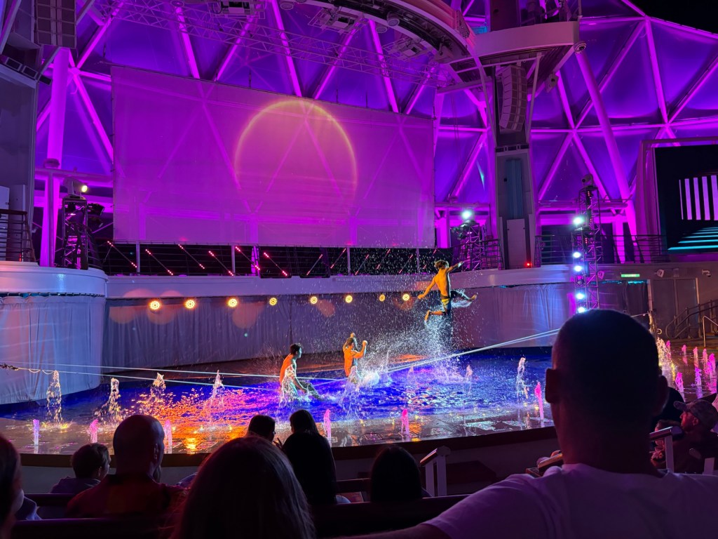 Back on the ship, we showered, dressed up, and headed to dinner followed by the Aqua Theater show. If you’re ever on an Oasis Class ship, DO NOT miss the aqua show. It’s like Cirque du Soleil met the Olympics and decided to throw a pool party. Dancers, divers, tightrope walkers—Utopia’s show had it all. I was so mesmerized I didn’t take a single photo. Luckily, my daughter saved the day with a few snaps.